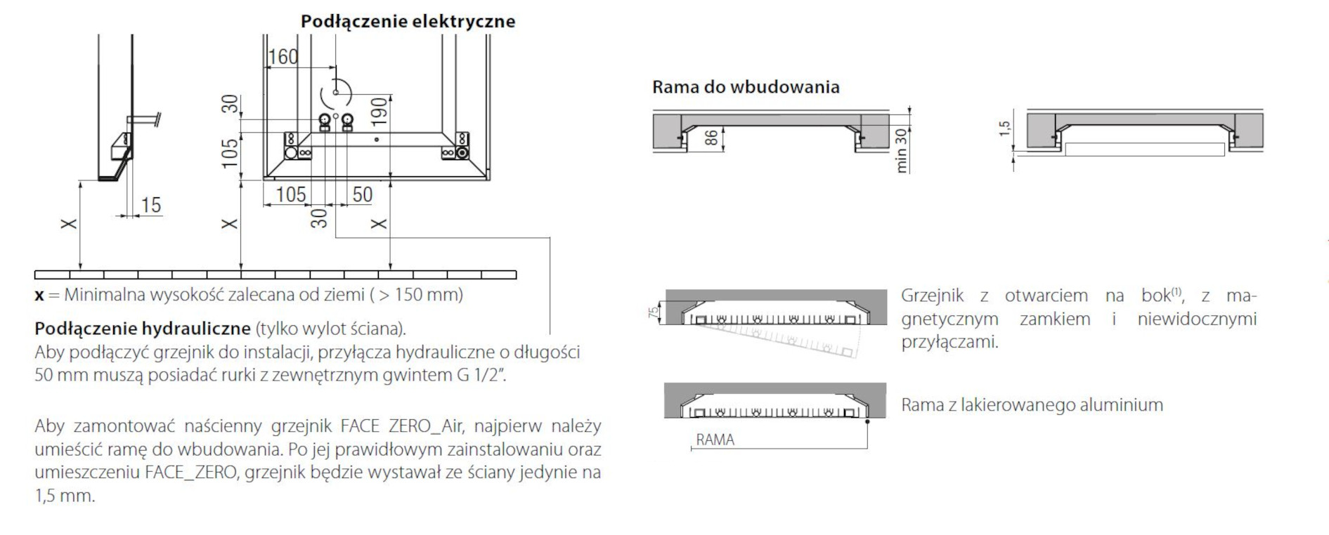 Model Irsap Face Zero_Air charakteryzuje się innowacyjnym sposobem instalacji. Obudowa grzejnika jest przystosowana do zainstalowania w ścianie. Po prawidłowym zamontowaniu modelu grzejnik będzie wystawał jedyne 1,5 mm poza ścianę.